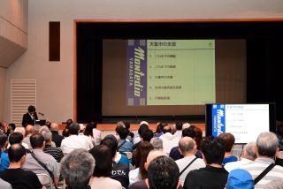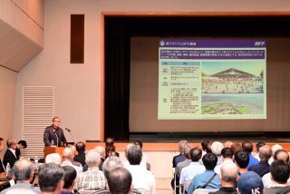 9月6日、モンテディオ山形新スタジアム建設に係る市民説明会が、市民文化会館で開催されました。㈱モンテディオフットボールパーク代表取締役社長の相田健太郎さんから、スタジアム整備の内容や工事の見通しが提示され、市の担当者からはスタジアム建設の支援やインフラ整備の見通しなどの説明が行われました。