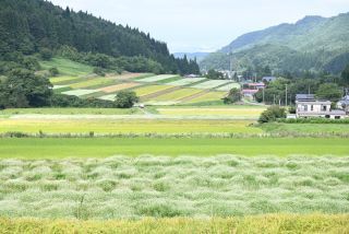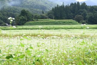 やまがたの棚田20選に登録されている「田麦野の棚田」で、収穫間近の稲穂と満開を迎えたソバの花のコントラストが見事な風景が広がっています。稲刈り後は、杭掛けの風景を見ることができます。