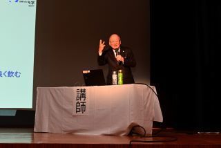 11月18日、市民プラザで、本市と明治大学の連携協定15周年を記念した講演会が開催され、同大学校友会会長の北野大さんが「北野家の訓え」と題し講演を行いました。北野さんは「若い時の苦労は買ってでもするものだ」など、母親から受けた数々の教訓を、弟の北野武さんとのエピソードを交えながら紹介しました。また、おせっかいを生きがいとしていた母親の姿を例に挙げながら、「健康で長生きするには、自分に合った生きがいを見つけることが大切」と語っていました。