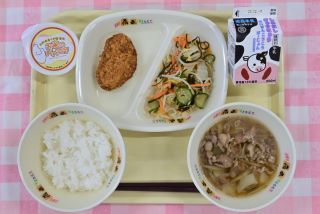 11月28日、二中で、天童産食材の生産者や、学校給食協力会の皆さんを招いて笑顔まんてんどう給食が行われました。これは、生徒が食と農への理解を深め、日頃の感謝を生産者に伝えるために実施しているものです。この日は天童産のつや姫ご飯や、天童産の牛肉や里芋、ネギを使った芋煮など5品が提供されました。生徒たちは農作業のやりがいや苦労などを質問しながら、一緒に給食を食べて交流しました。