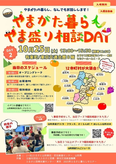 10月25日(土)に東京交通会館(東京都千代田区有楽町)で開催される「やまがた暮らしやま盛り相談DAY【DAY2】」に出展します!たくさんの情報を得ることができる貴重な機会です!ぜひお気軽に会場へお越しください!