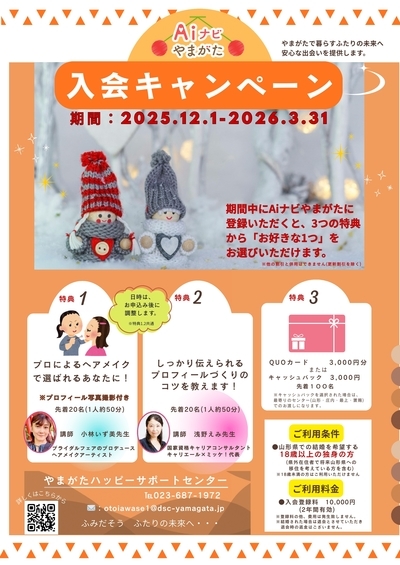 Aiナビやまがた入会キャンペーンが2025年12月1日(月)~2026年3月31日(火)まで開催されます。
