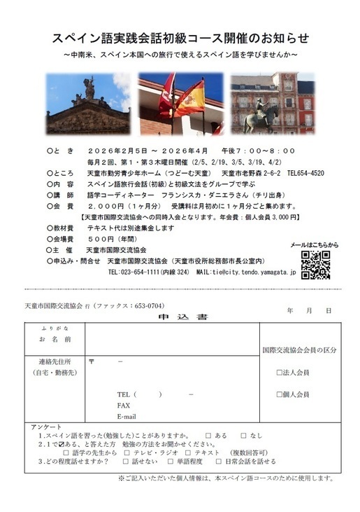 2026年2月から4月までの3か月間の予定で、スペイン語実践会話初級コースを開催します