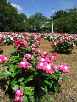 令和7年7月6日の夏の会には、社会教育団体や建設業関係団体など7団体約90人が、日日草の花苗1,100株を植栽しました。